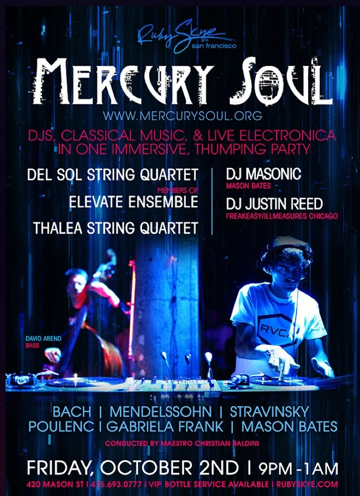 Led by composer/DJ Mason Bates (aka DJ Masonic), Mercury Soul is a hybrid music event featuring classical and DJ sets merged together with engaging electro-acoustic interludes. Using the innovations of modern lighting and club production, Mercury Soul re-imagines the classical music experience for a broad audience in extraordinary spaces, from clubs to warehouses to concert halls.