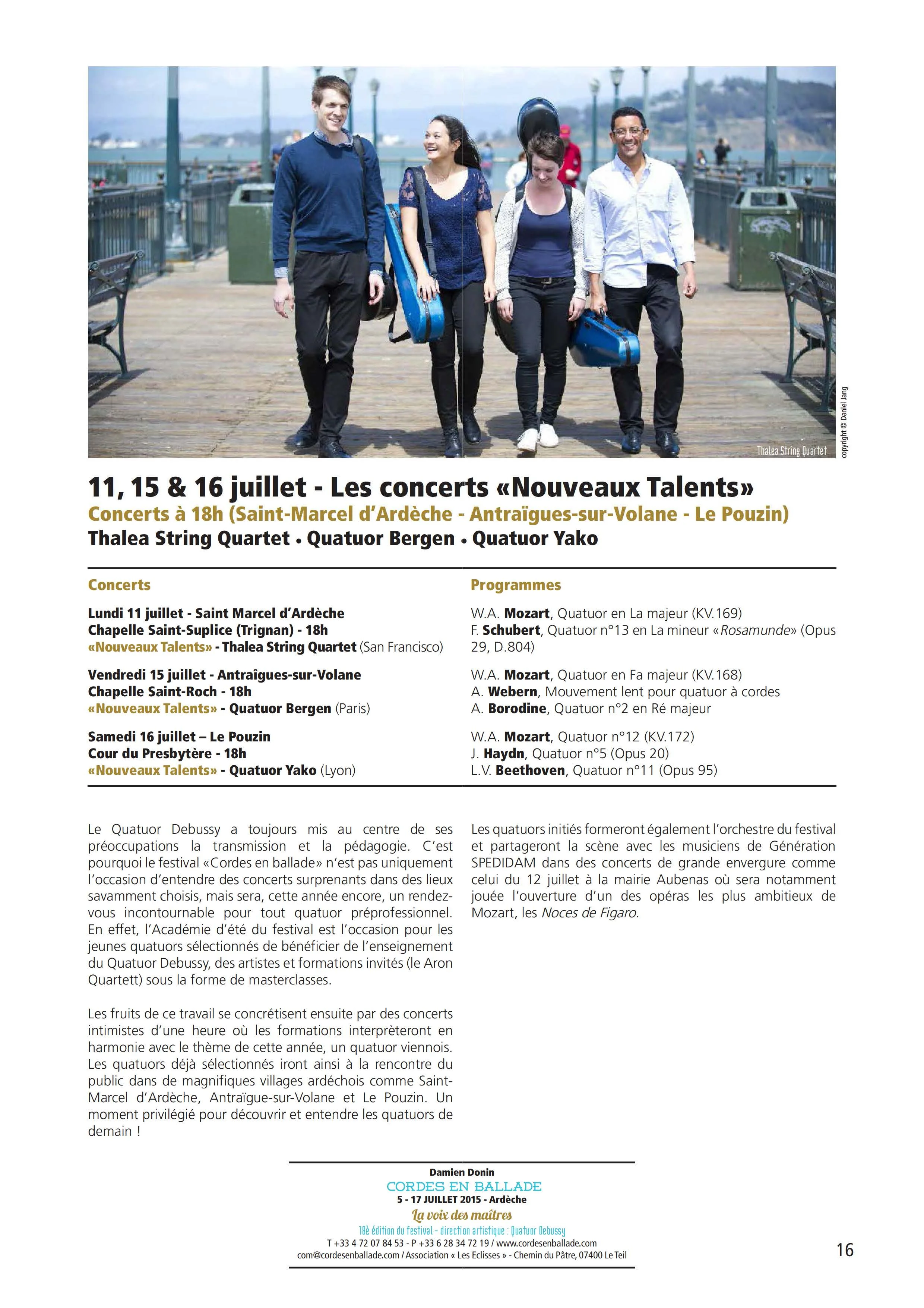 Le Quatuor Debussy a toujours mis au centre de leurs préoccupations la transmission et la pédagogie. C’est pourquoi le festival Cordes en ballade n’est pas uniquement l’occasion d’entendre des concerts surprenants dans des lieux savamment choisis mais sera, cette année encore, un rendez-vous incontournable pour tout quatuor pré-professionnel. En effet, l’académie d’été du festival est l’occasion pour les jeunes quatuors sélectionnés de bénéficier de l’enseignement du Quatuor Debussy et des artistes et formations invités sous la forme de Master-classes.